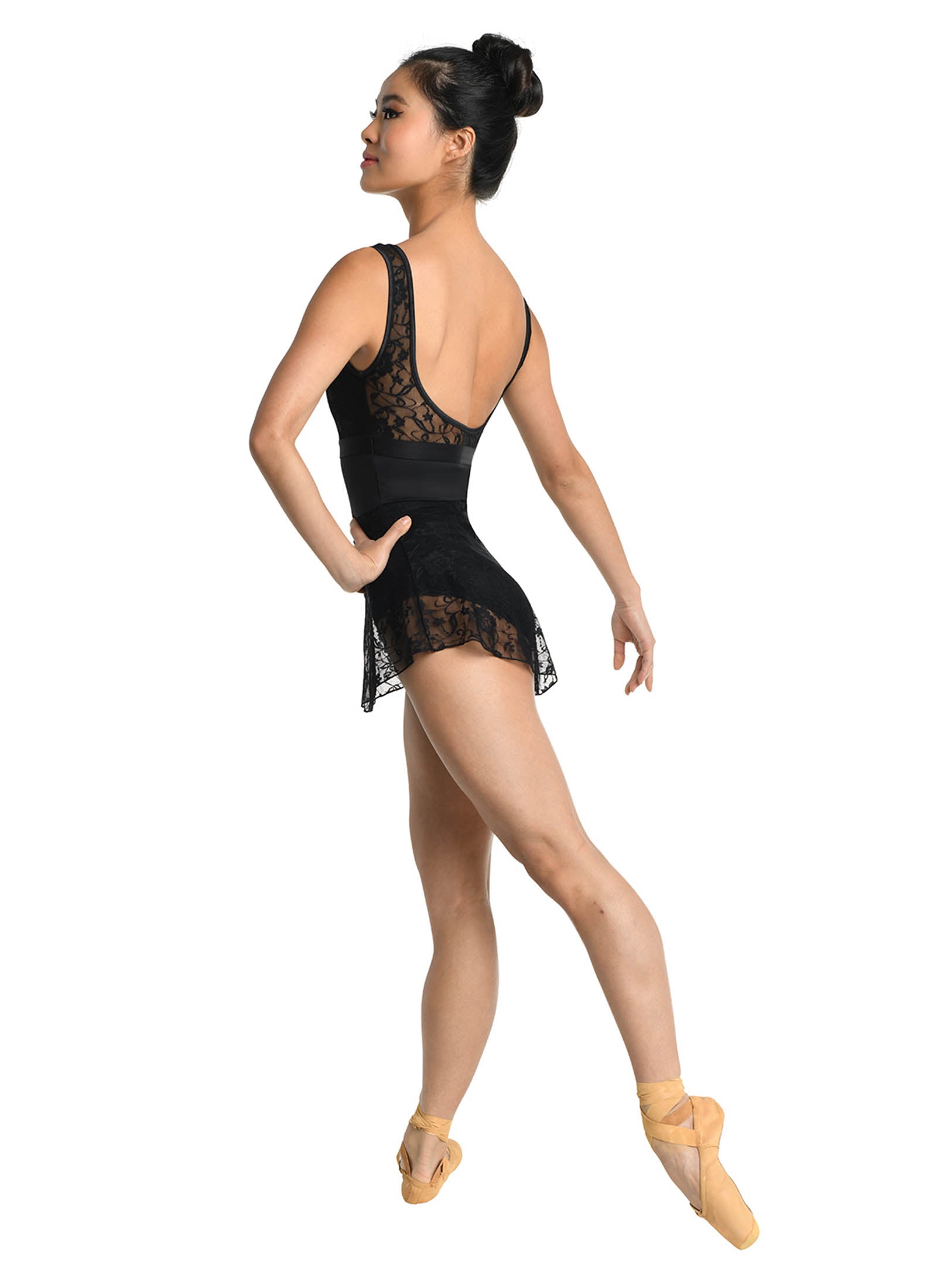 lace skirt has a raw edged hem. Sides of skirt are cut higher to elongate the legs. Skirt coordinates with the collection or with any black leotard. Polyester/Spandex.