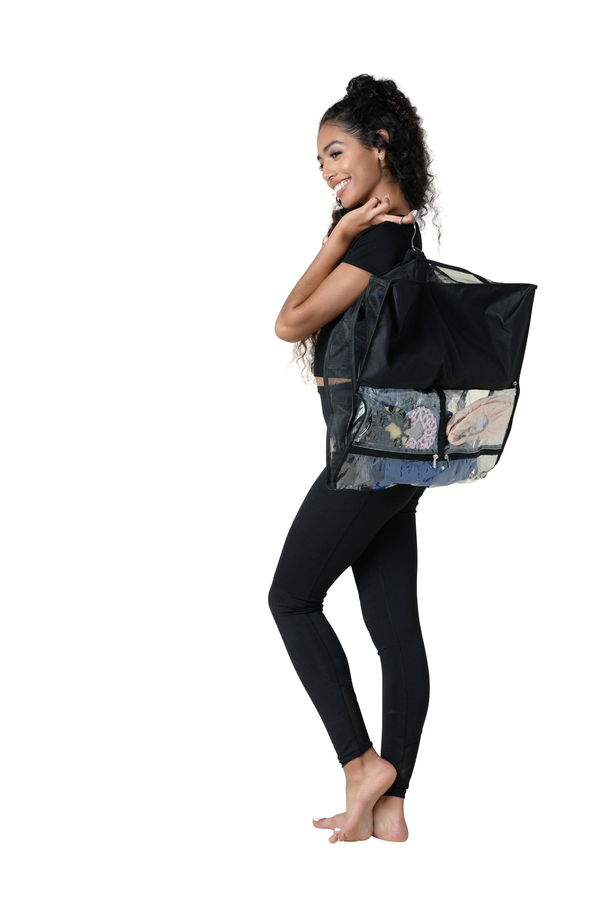- Lavender & Pink bags have 3 clear pockets; Black & White bags have 2 clear pockets and 1 privacy pocket.