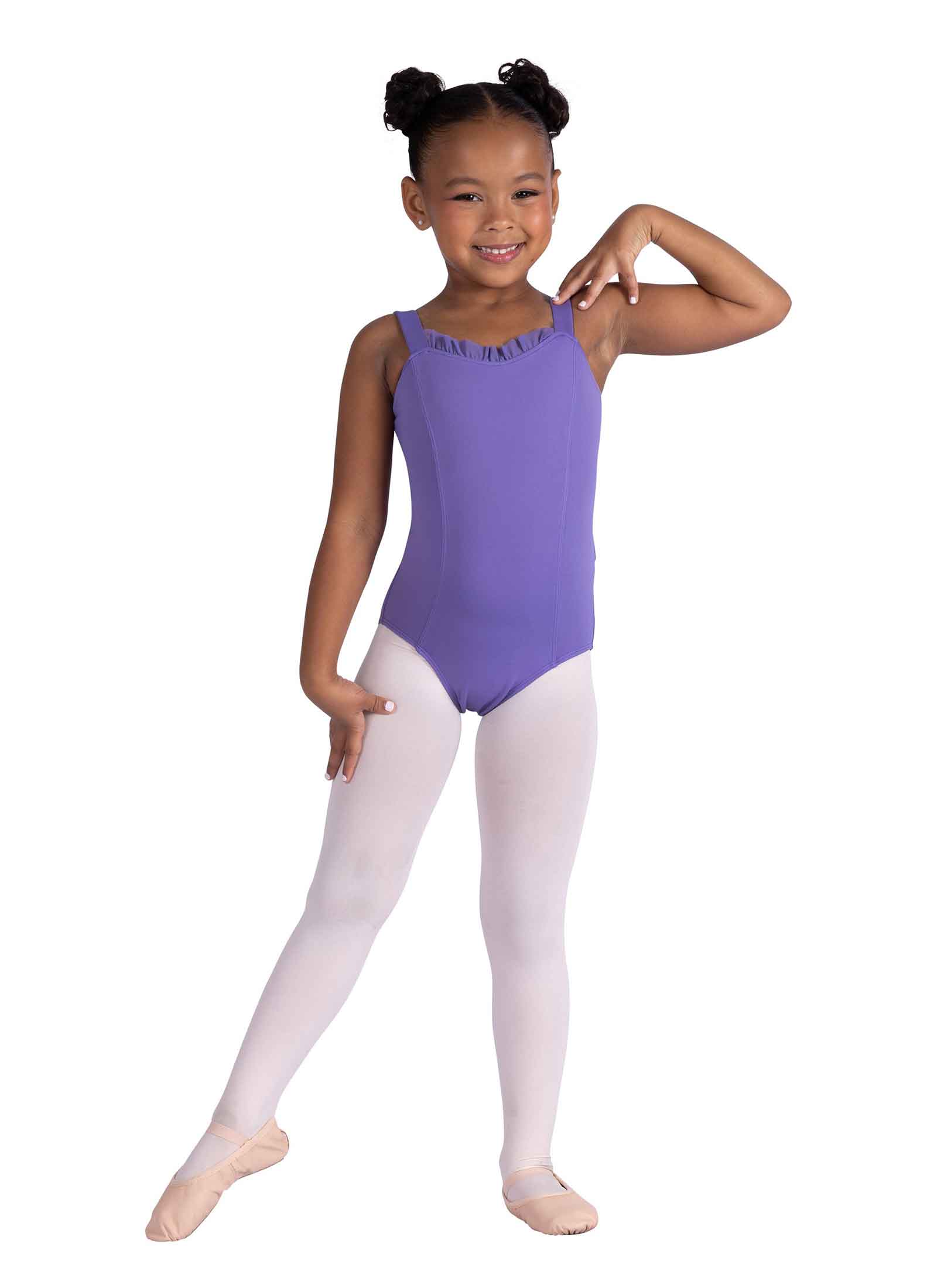 Wide, elasticized strap camisole leotard with ruffle sweetheart neckline and flattering princess seams. Double stacked bow detail at back. Fully front lined. Nylon/Spandex.