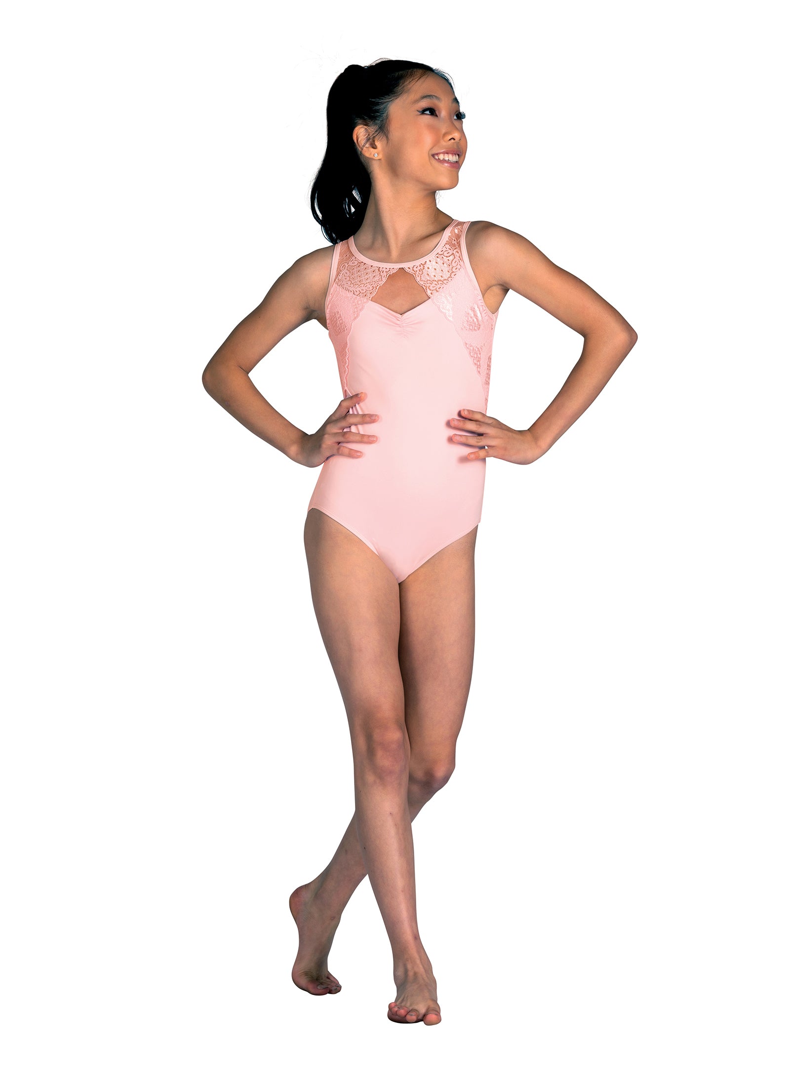 Tank leotard with engineered scallop lace contrast bolero and back. Features delicate center front neck shirring and latch closure at back neck. Girls fully front lined. Nylon/Spandex.