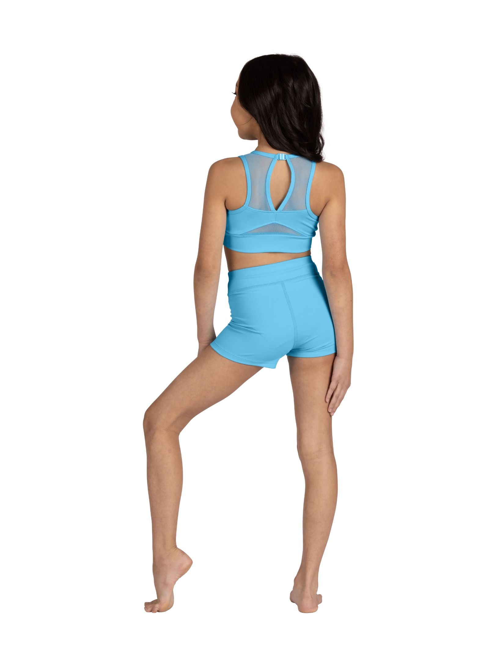 Cutaway tank top with deep V-mesh insert and stylized mesh block detailing at back. Fully front lined. Polyester/Spandex.