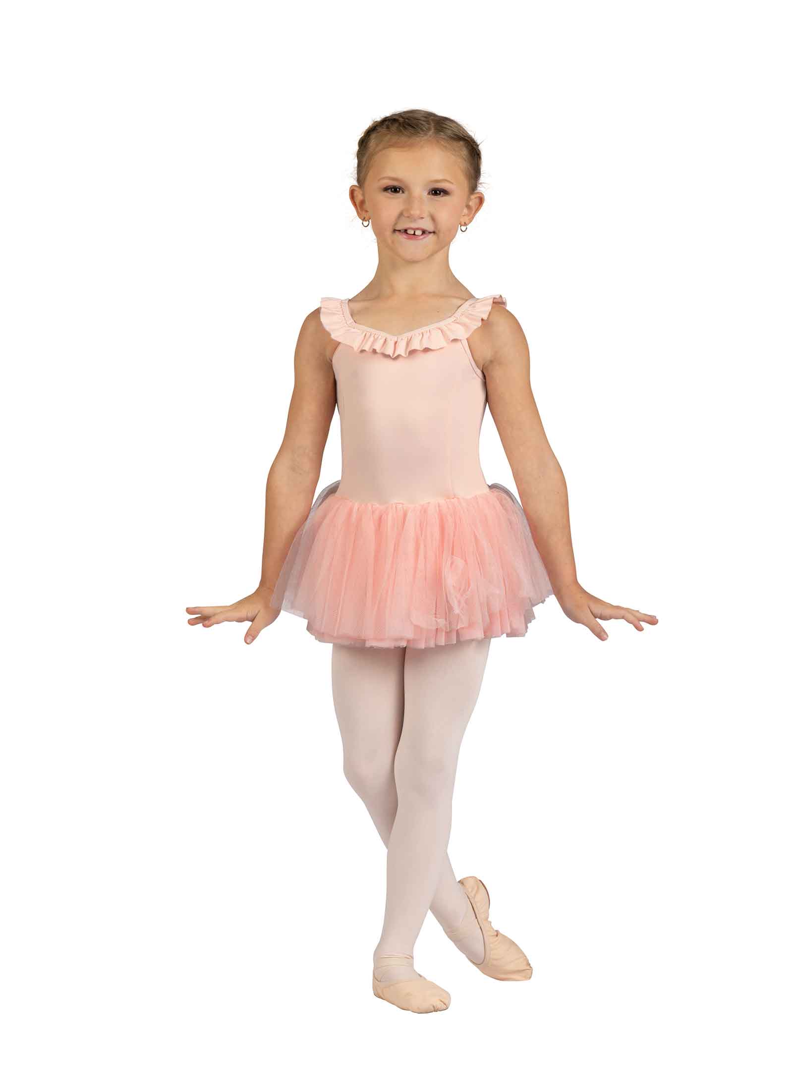 Girl’s ruffle trim dress features princess seams, mesh back insert with bow, and full volume mesh skirt. Fully front lined. Nylon/Spandex.
