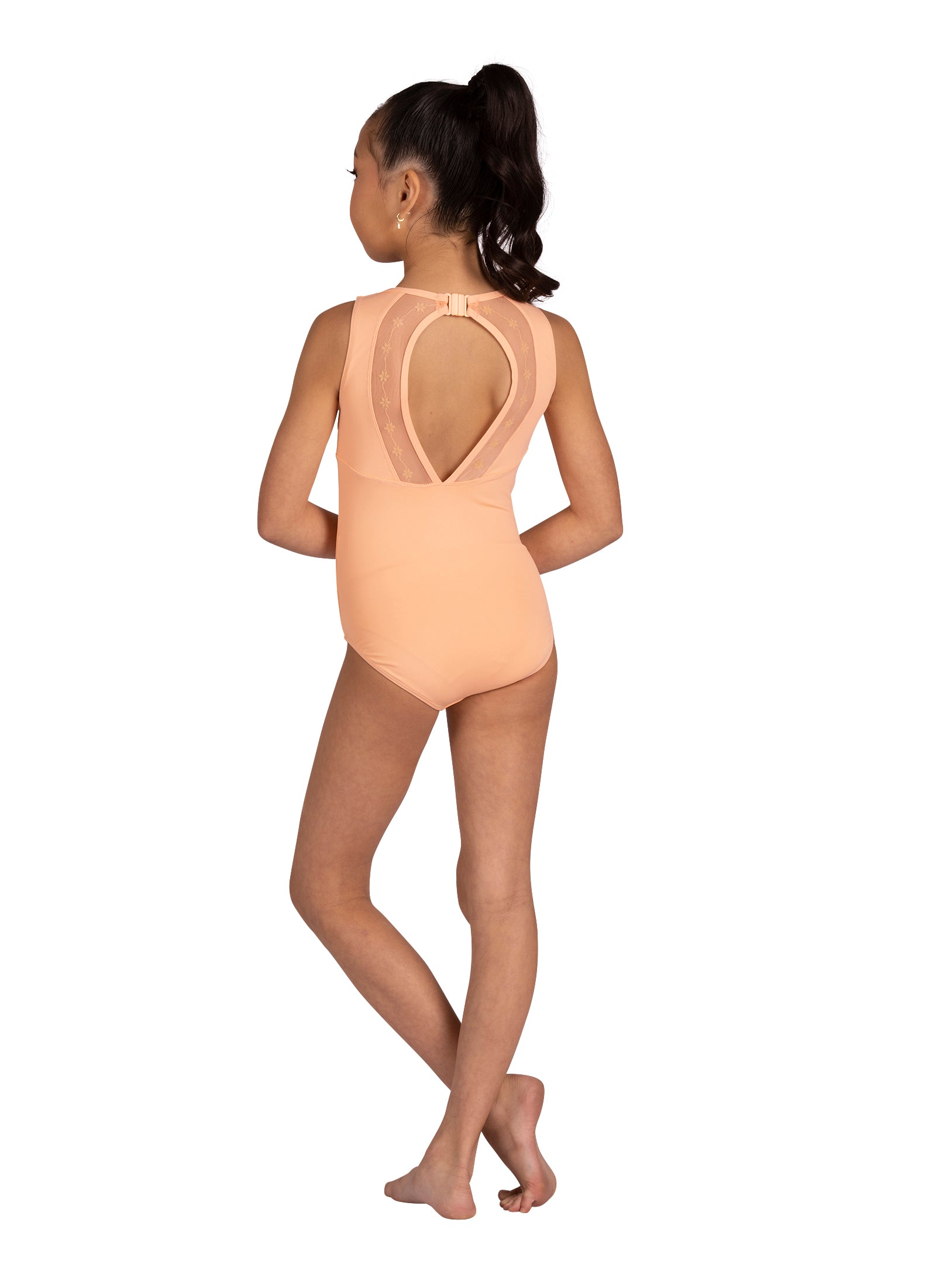Tank leotard with raised floral print at mesh front and along the keyhole back. Clasp at back. Fully Front lined. Nylon/Spandex.