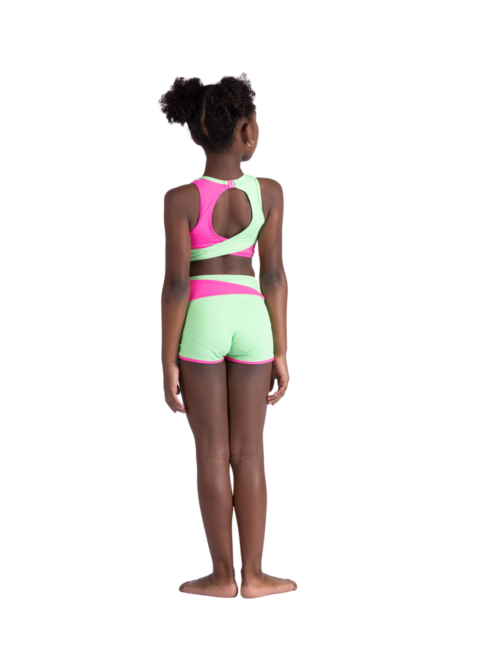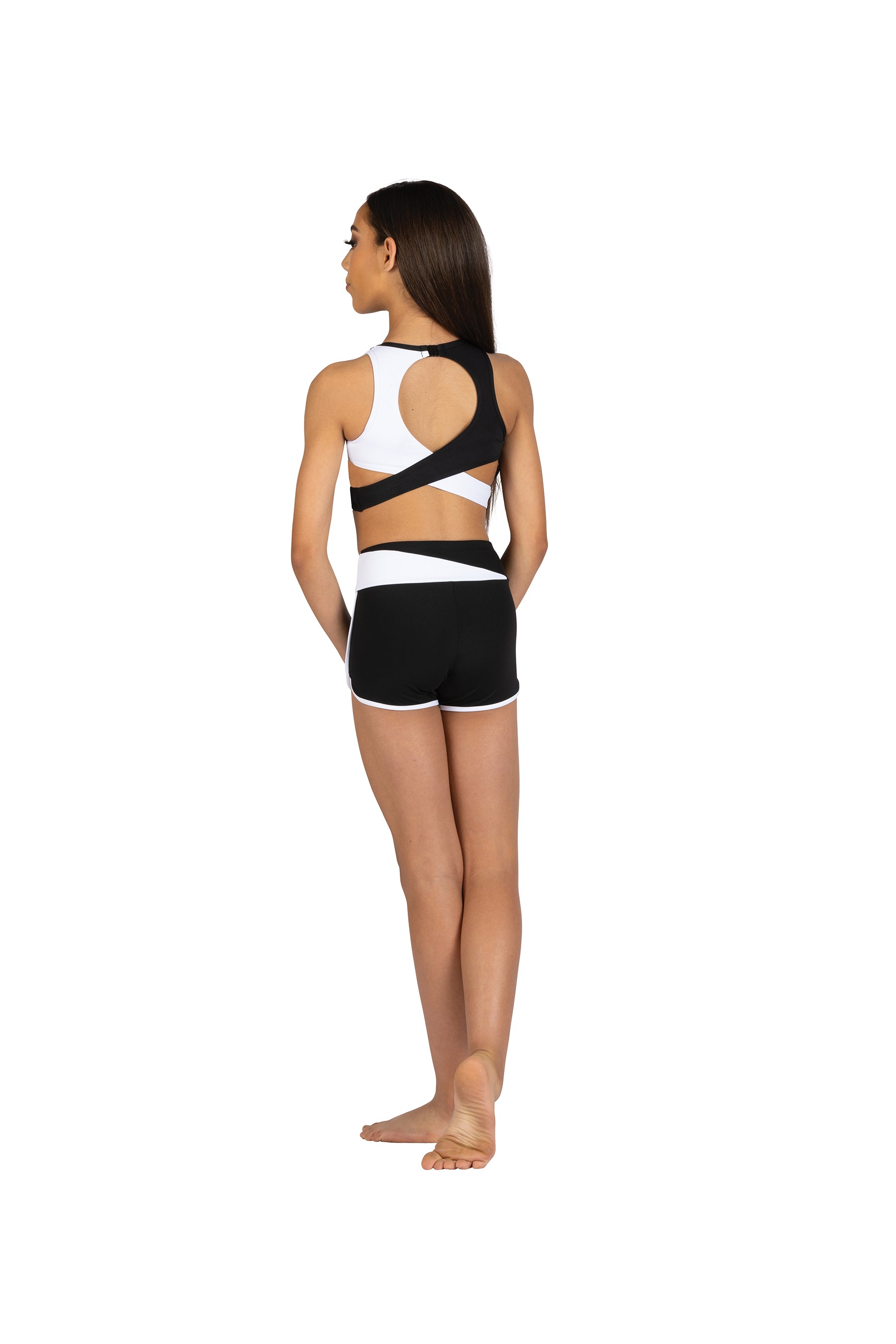 Booty short featuring a two-tone, V-shaped waistband and jogger short taping along sides and leg openings. Polyester/Spandex