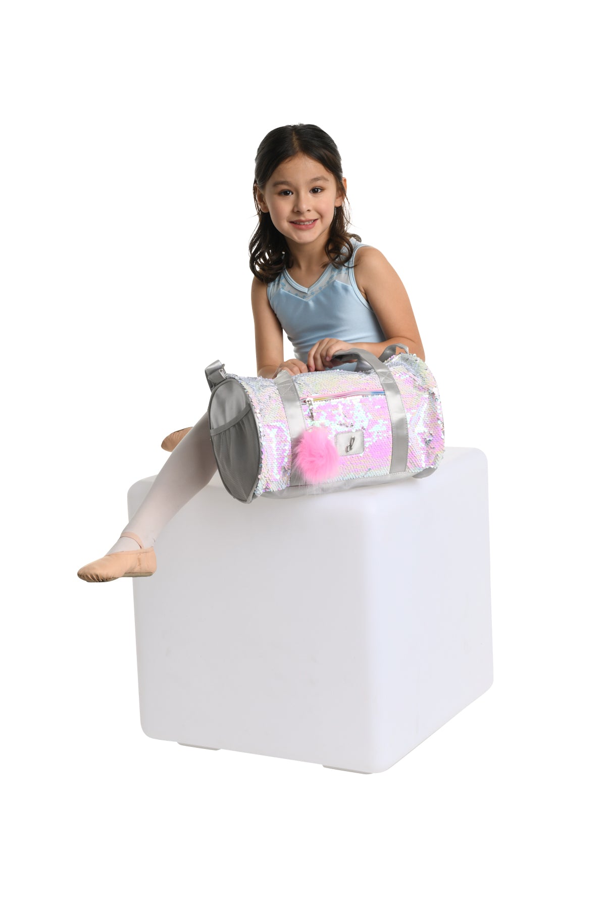 A fun and reversible pearlescent sequin duffel. Sequins reverse from pink to silver pearlescent colors. Features three outside pock- ets that allows for ample storage. Adjustable shoulder straps and double handles for flexibility in carrying. Made with fabric that’s easy to wipe clean. Includes removable pink plush pom-pom and water-repellent inner lining. Light weight and folds flat.